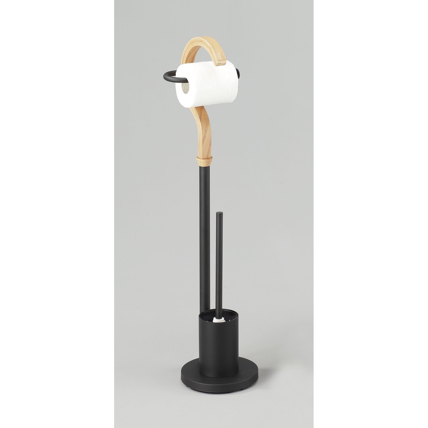 Toiler toilet roll hanger in Oak rod and Matt Black Epoxy steel leg