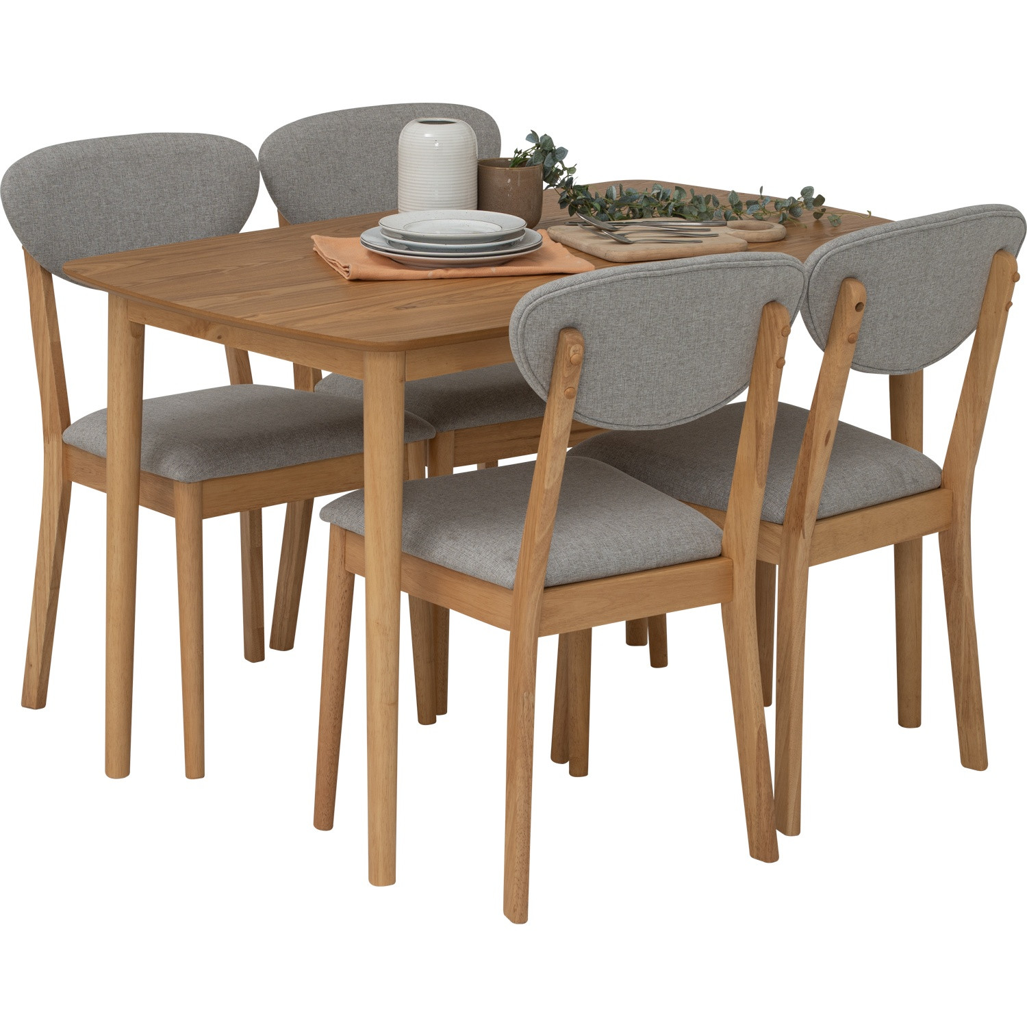 Josie dining set 1+4 in Natural colour wood frame, Light Grey colour Challis fabric seat